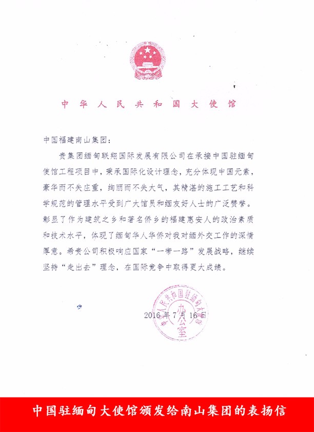 中國(guó)駐緬甸大(dà)使館頒發給南(nán)山(shā∞↑♥n)集團的(de)表揚信